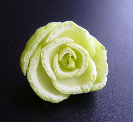 今日は昨日の片付けの続きと、たまりにたまった家の用事に一日追われていました。 実家のおてんばの散歩も7日ぶり。 心なしかおとなしくなっていた気が・・・。 そして、疲れて頭がボーっとしていたせいか、いつもと違うことをして、思わぬことを発見してしまいました。 こちらです。これはなんでしょう? 実は青梗菜なんです。 いつもは、根元のところから葉っぱを手でむいていくのですが、何を思ったか、今日は包丁で切り落としてしまいました。 そうしたら、根元の部分が残って、ふと見たらこんな形に。 わぁ、これバラ!? なんだか捨てるのがもったいなくて、またもやキッチンの窓辺に飾ってしまいました。 先日のさくらんぼの柄と卵の殻で出来た“オバQ”はさすがに処分してしまったので、今度の窓辺の特等席はこの緑のバラに。 いつまで持つかなぁ。 さて、話は変わりますが、今日集計したところ、今回のイベントの来場者数はなんと、約150名。 初の試みにしてはスゴイ!と我ながらびっくり。 ただし、オープンとは謳ったものの、次回はまだ未定。(苦笑) この機会に是非展を開いて見ませんか? 興味がおありの方は是非ご連絡ください!