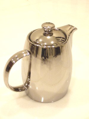 このポットの素材、一体何でしょう? 輝き具合からするとシルバー?ステンレス? いえいえ、セラミックスです。 思わず手にとってびっくり。 金属かと思ったのに、ずっしり思い。 銀座の雑貨屋さんで発見、ついつい一目ぼれで購入してしまいました。 形的にはティーではなくコーヒーポットのようですが、この際そんな贅沢は言ってられません。 このシリーズ、お皿やカップなどアイテムがいくつかありましたが、すべてシルバー(カラー)一色というのはこのポットのみ。 早くこのポット、お教室で使ってみた~い。 皆さんきっと驚かれることでしょう。 でもここでご紹介してしまったらブログをご覧いただいている生徒さんには、バレバレですね(苦笑)。