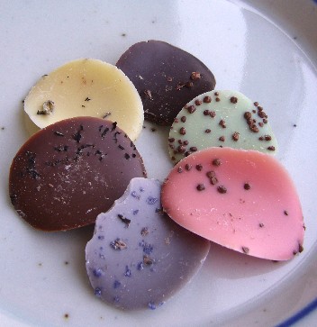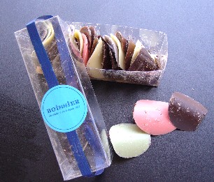 またまたボワシエのチョコレートです。 今度は本場パリ土産! しかも、あの有名な花びら形のペタルアソートです。 花びらをかたどったチョコレートの片面に、ハーブの粒や様々なフレーバーがちりばめられているもので、種類はローズ、ジャスミン、スミレ、ラベンダー、ヴェルヴェーヌに、キャラメルティーとダークチョコレートを加えた7種。 チョコレート自体は言うまでもなくおいしいので、あえて、それ以外の感想を書くと、 フランスのチョコレート、という感じで、かなり香りが強いです。 ラベンダーのチョコレートはそのままポプリを食べている感覚に近い・・・。 これは香料ではなく、本物の香りかもしれませんが、紅茶に代表されるように一般にフランスのフレーバーは結構強烈なものが多いですね。 かなり前ですが、プランタン銀座のアンジェリーナでいただいたケーキに、香料を食べているのか!?と思うくらい香りの強いものがあったのを思い出しました。 ここのモンブランの大ファンだっただけに、ちょっとびっくり。 それからはモンブラン以外のケーキに挑戦してません(苦笑)。 とはいえ、このペタルアソート、香りが強烈ながら、決して下品な感じはありません。 ルックスも派手~というわけではなく、さりげなくエレガントで上品。 花びらにこういうフレーバーの粒粒をちりばめるというアイデアも面白いです。 やや古臭い言い方ですが、“淑女”という言葉が似合う、そんな印象を受けました。 女性へのギフトにおすすめのようですが、納得。 飾っておいても絵になりそう! 贈る方も受け取る方も華やかな気分になれるうれしいギフトでしょう。 女性が好みそうといえば、こういうソープもありそうですね、ハーブ石鹸みたいで。 実は石鹸とチョコレートって、似たルックスのものが多い気が。 あと、ケーキ屋さんと美容院! これは結構定番で、自分だけでなく、その外観を間違えそうになったという話をよく聞きます。 最近はジュエリーショップと見まごうようなショーケースもありますし、そう考えると、スウィーツは食というより、ファッションのカテゴリーに近い感覚なのかもしれませんね。 ジュエリーといえば、その昔“宝石箱”という、色つきの氷の粒粒がちりばめられたアイスクリームがありましたっけ。 って、連想ゲーム!?(苦笑)。
