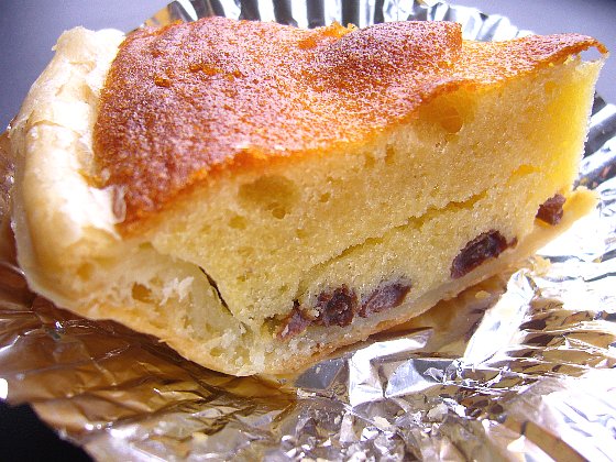 アメリカンタイプのパイケースにクレームダマンドまではいかない、軽めのアーモンド生地、底にはラムレーズンがこれでもかと敷き詰められています。